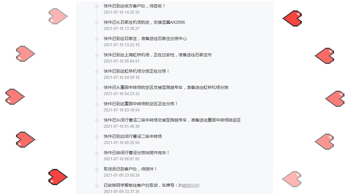7月10日,下午14:25分, 河北石家莊等待客戶簽收。
